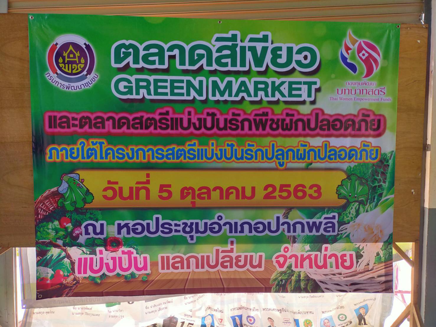 เวลา 09.00 น. นายเสฏฐชัย  ยุทธเศรษฐสิริ พัฒนาการจังหวัดนครนายก มอบหมายกลุ่มงานสารสนเทศการพัฒนาชุมชนร่วมกิจกรรมตลาดสีเขียว “Pakphli Green Market” และตลาดสตรีแบ่งปันรักพืชผักปลอดภัย เพื่อซื้อขาย แลกเปลี่ยน แบ่งปันพืชผักสวนครัวร่วมกันของผู้เข้าร่วมกิจกรรมการปลูกผักสวนครัว เพื่อความมั่นคงทางอาหาร เพื่อส่งเสริมกิจกรรมดำเนินการตามแผนปฏิบัติการ 90 วัน “ปลูกผักสวนครัวเพื่อสร้างความมั่นคงทางอาหาร “ทั้งสองระยะ และโครงการ “สตรีแบ่งปันรัก ปลูกผักปลอดภัย” โดยมอบเมล็ดพันธ์ผักแก่ผู้นำและประชาชนทั่วไป ในวันประชุม กำนัน ผู้ใหญ่บ้าน โดยนางสาววรรณี  วุฒิฤทธากุล นายอำเภอปากพลี ร่วมกิจกรรมฯ พร้อมทั้งผู้นำชุมชนร่วมซื้อ-ขาย แลกเปลี่ยน พร้อมทั้งแบ่งปันพืชผักสวนครัวชนิดต่าง ๆ