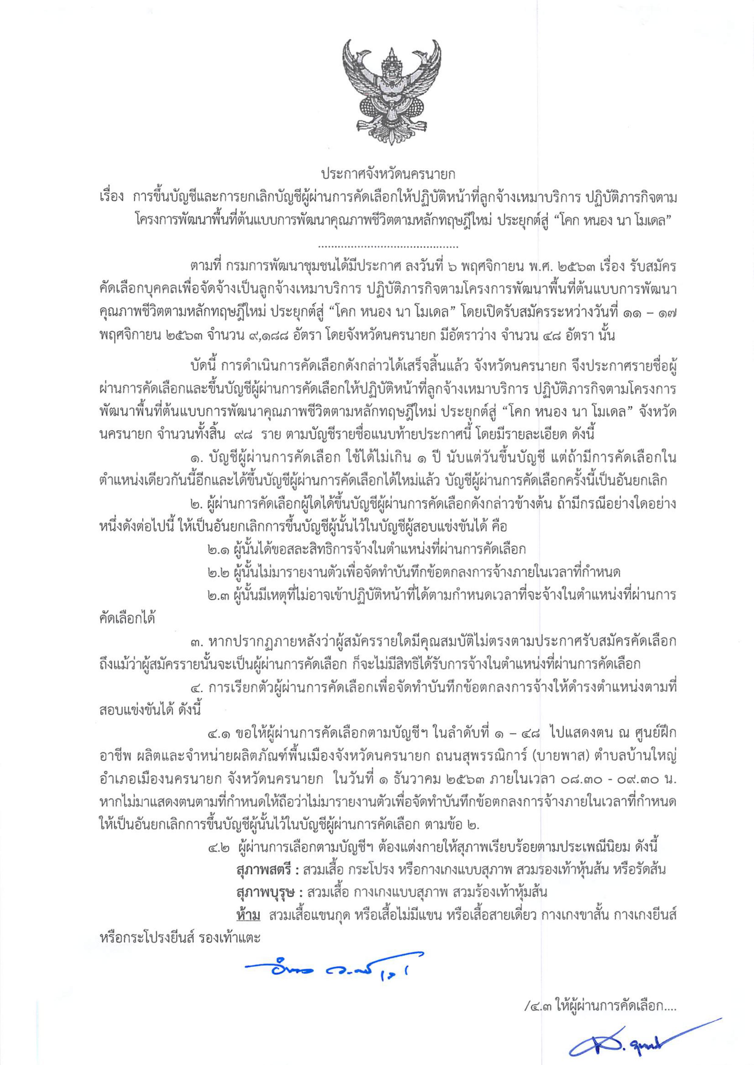 ประกาศจังหวัดนครนายก ลงวันที่ 30 พฤศจิกายน 2563 เรื่อง ขึ้นบัญชีและยกเลิกบัญชีผู้ผ่านการคัดเลือกให้ปฏิบัติหน้าที่ลูกจ้างเหมาบริการ ปฏิบัติภารกิจตาม โครงการพัฒนาพื้นที่ต้นแบบการพัฒนาคุณภาพชีวิตตามหลักทฤษฎีใหม่ ประยุกต์สู่ “โคก หนอง นา โมเดล” จังหวัดนครนายก