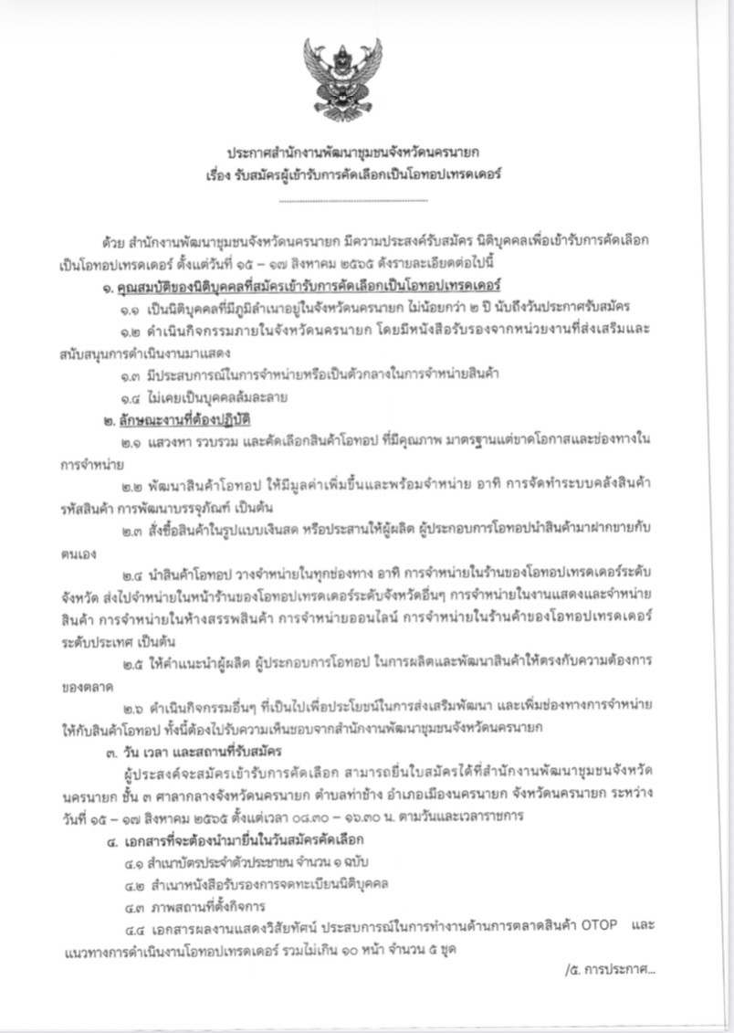 สำนักงานพัฒนาชุมชนจังหวัดนครนายก มีความประสงค์รับสมัคร นิติบุคคลเพื่อเข้ารับการคัดเลือกเป็นโอทอปเทรดเดอร์ ตั้งแต่วันที่ ๑๕ – ๑๗ สิงหาคม ๒๕๖๕ รายละเอียดเพิ่มเติม