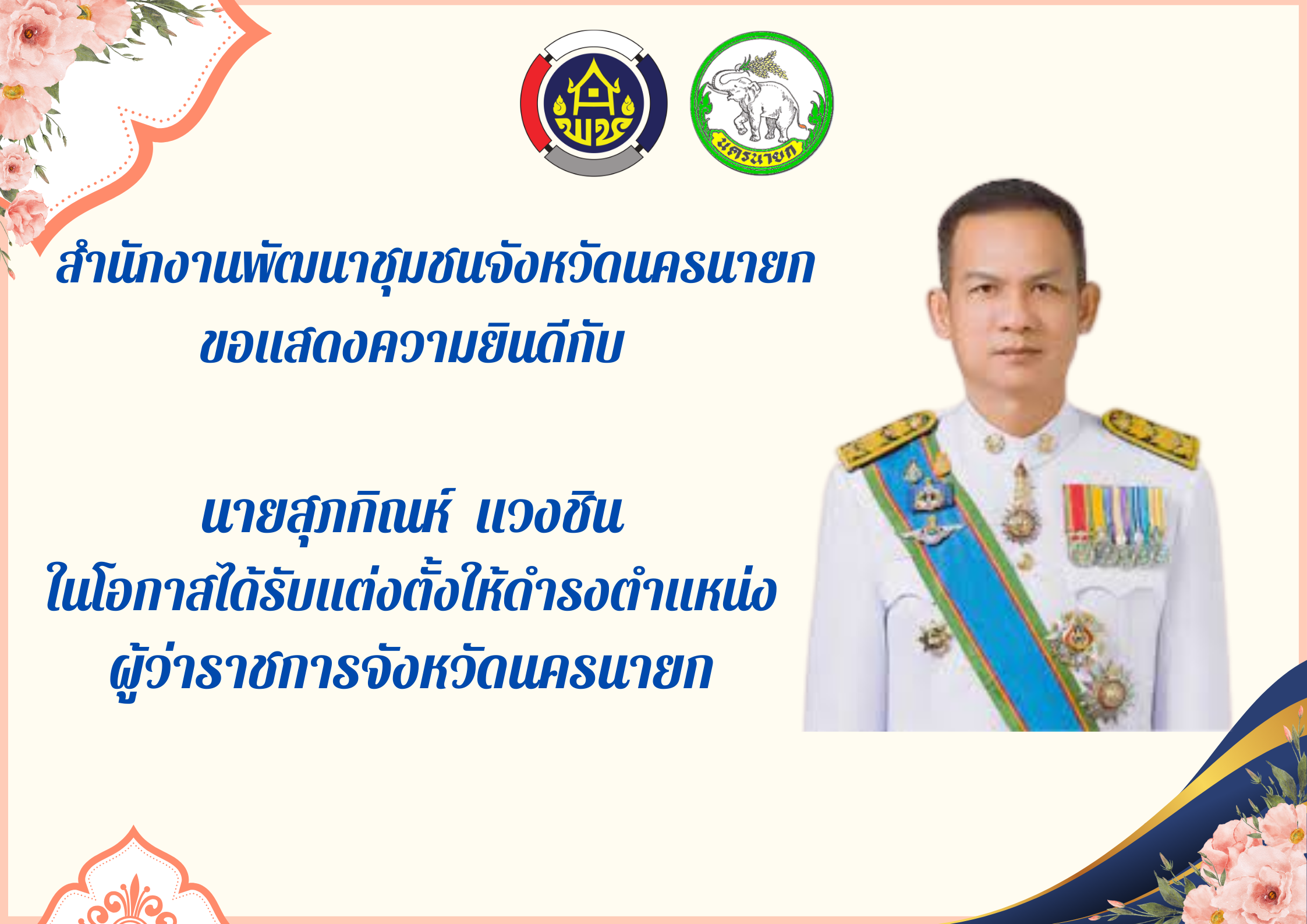 นายวิลาศ บุญโต พัฒนาการจังหวัดนครนายก ในนามสำนักงานพัฒนาชุมชนจังหวัดนครนายก ร่วมแสดงความยินดีกับ นายสุภกิณห์ แวงชิน เนื่องในโอกาสได้รับแต่งตั้งให้ดำรงตำแหน่งผู้ว่าราชการจังหวัดนครนายก