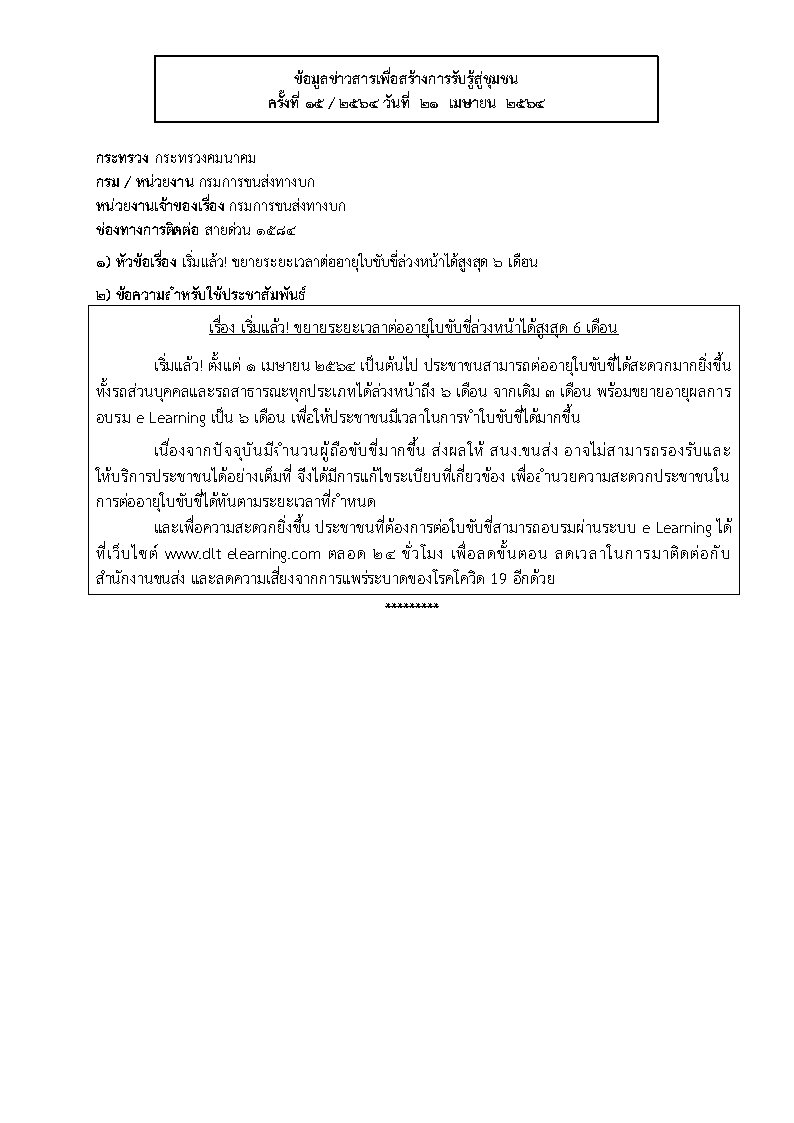 ข้อมูลเพื่อสร้างการรับรู้สู่ชุมชน ครั้งที่ 15/2564
